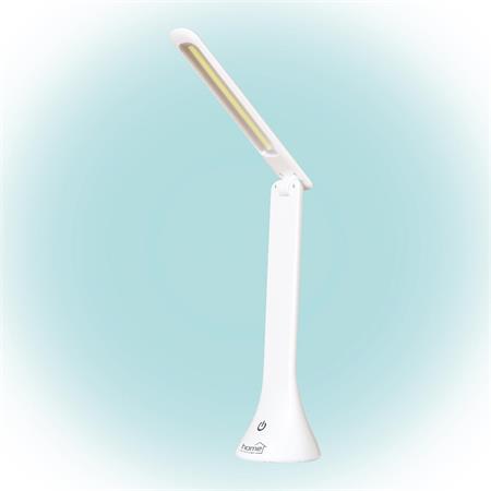 Modern, érintőgombos asztali lámpa, a hideg fény fényereje három fokozatban állítható, tápellátása hálózati adapterrel vag elemekkel biztosítható.